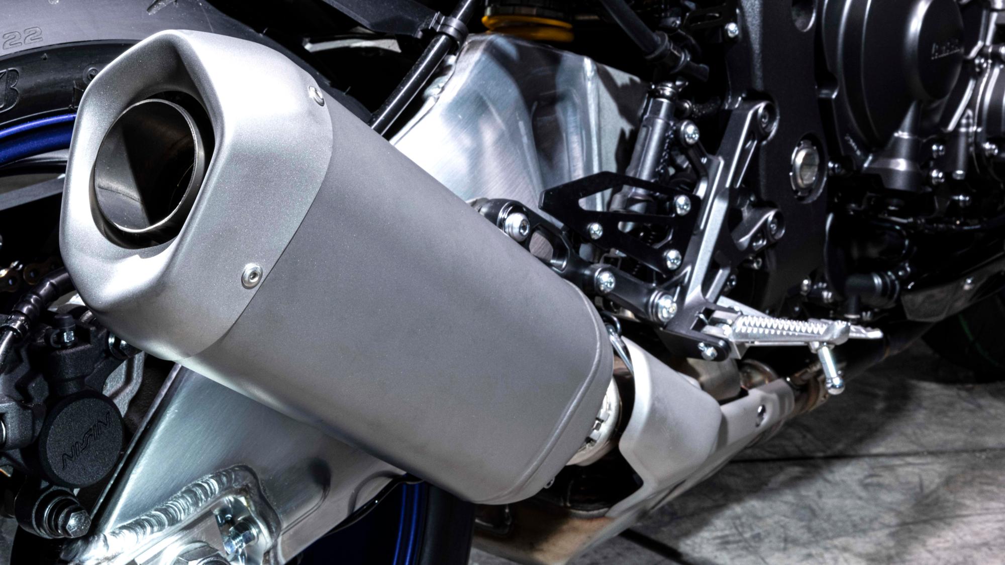 Jakmile stisknete tlačítko startéru, uslyšíte a pocítíte jedinečný zvuk, který vydává speciálně vyladěný titanový středový tlumič výfuku se symetrickým levým a pravým výfukovým potrubím. Spolu s vyladěným systémem sání využívá nerovnoměrné sekvence zapalování motoru s klikovým hřídelem crossplane k vytvoření jedinečného a vzrušujícího tónu výfuku, který nezní jako u žádného jiného motocyklu.